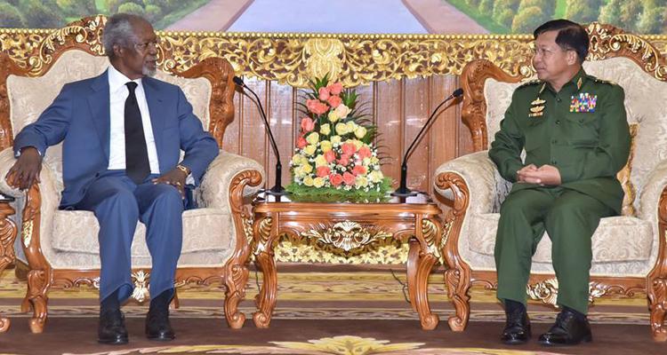 据内比都24日消息, 若开邦事务顾问委员会主席科菲•安南于今日上午在内比都巴英瑙别墅拜会了缅甸三军总司令敏昂莱大将,相互讨论了若开邦事务调查报告书的内容。科菲•安南将于今日下午四时在仰光香格里拉酒店举行记者招待会。