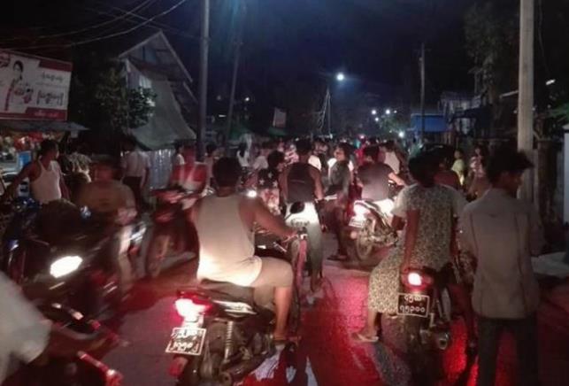 晚上8点,人群由50人增加到约300人,他们拿着石头、点着火的汽油瓶闹事。警方立刻出动了200名警员在现场维持秩序,然而百姓们强烈反抗,警方开枪警示,此后,实兑市的缅军也赶来帮助控制局面,在晚上11点人群才散去。