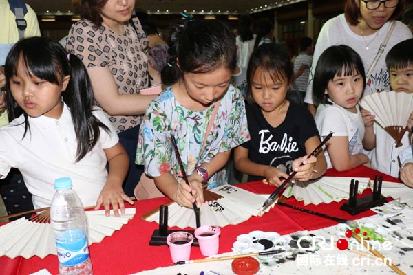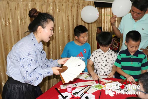 北京来的艺术家带小朋友一同为扇面作画