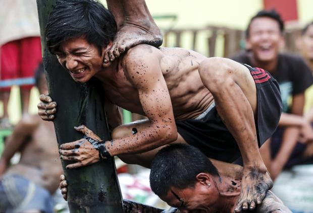 缅甸庆祝第70个独立日 民众身上抹油爬竹竿抢椰子球(组图)