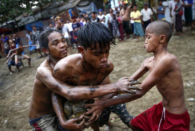 当地时间2018年1月4日,缅甸仰光,缅甸庆祝第70个独立日,民众举行枕头大战、身上涂着废机油抢椰子球等活动。