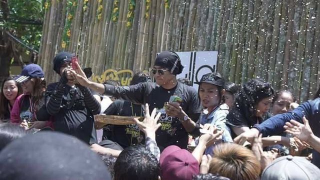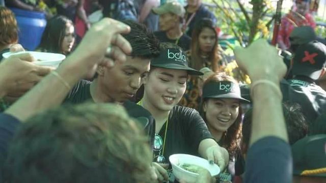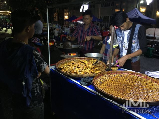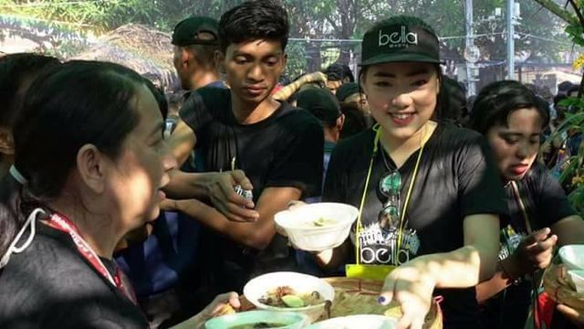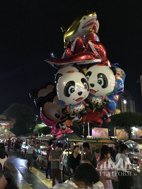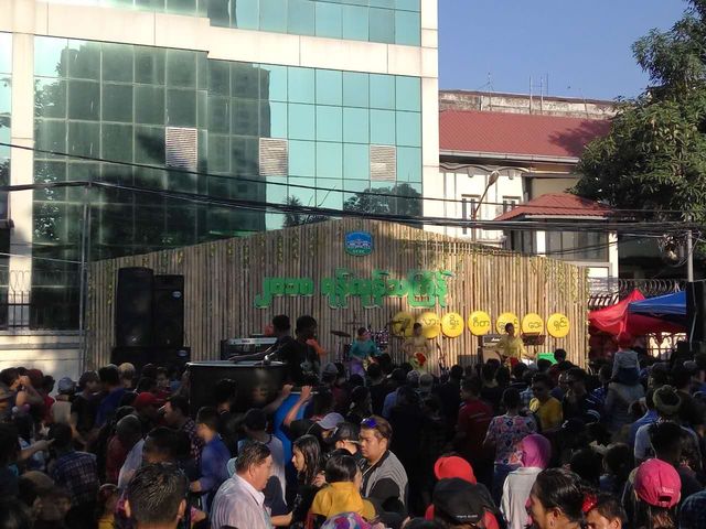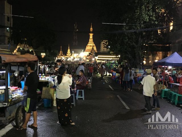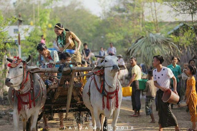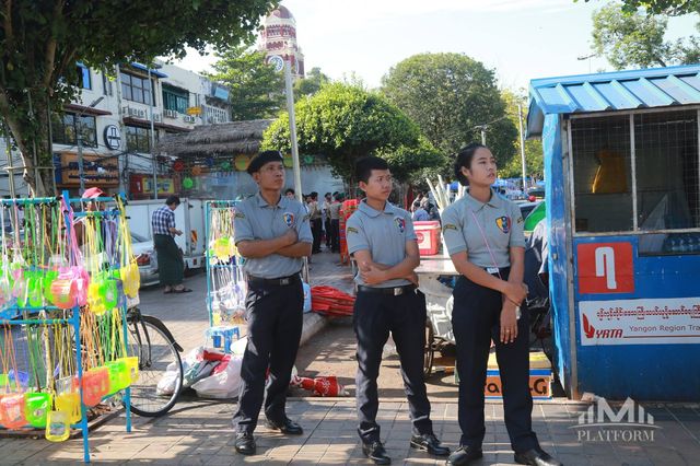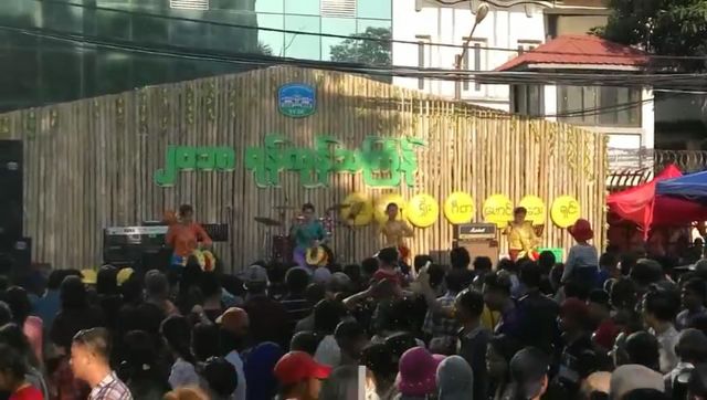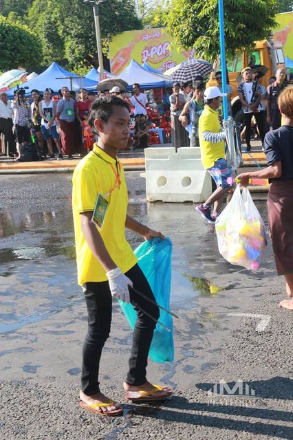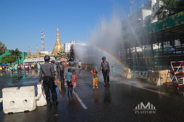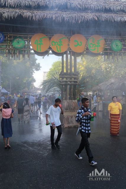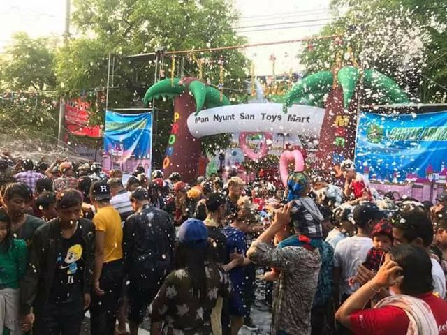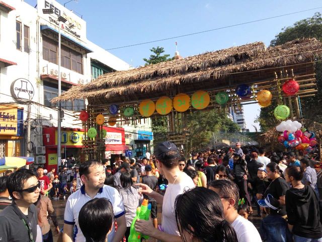 ▼今年仰光首次推出步行泼水节,提倡文明泼水。图为“苏丽公园”旁的“公园路”步行泼水街