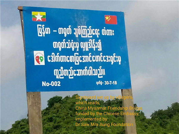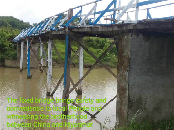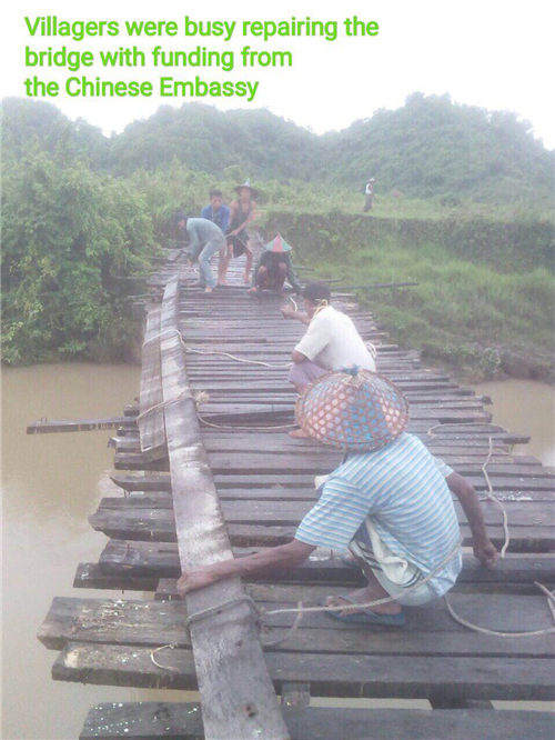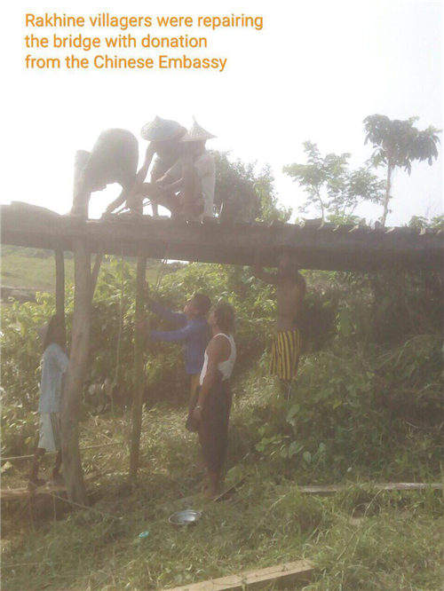 为帮助解决若开邦农村地区出行难问题,中国驻缅甸大使馆出资2000万缅币定向用于修缮若开邦两座农村桥梁。其中一座危桥已修缮完工,造福周边数百名村民。另一座已坍塌桥梁正在加紧抢修,该桥是连接当地村落与学校的必经之路,桥梁修复后将造福周边数千名村民特别是中小学生,将极大解决学生上学过河难问题。上述两座桥梁由缅甸梭妙昂基金会承建。