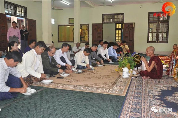 首先,按照缅甸传统风俗请高僧诵经,祈祷和平。随后,施主们进行滴水仪式,在一片‘阿妙!阿妙!阿妙!(分享功德)’以及‘大度!大度!大度!(善哉)’齐声呼颂后,法事圆满结束。