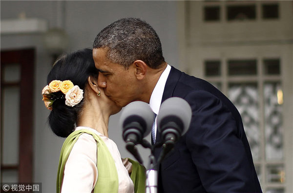 2012年11月19日,缅甸仰光,美国总统奥巴马在记者会上亲吻昂山素季。图自视觉中国