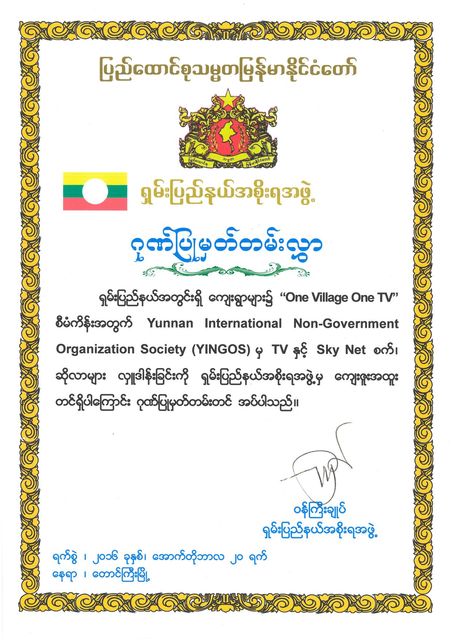 2016年10月20日,“一村一电视”项目捐赠仪式在掸邦东枝市正式启动,掸邦行政长官吴林突出席了捐赠仪式并代表掸邦政府向YINGOS颁发了荣誉证书,以表彰和感谢YINGOS为掸邦的发展作出的贡献。截止日前,电视设备已分批运送到各项目村并完成安装调试,广大村民在充分体验到了科技发展对生产生活带来的便利和多元化同时,也深切体会到此次“一村一电视”捐赠项目各组织实施单位为民、惠民、利民的初衷。