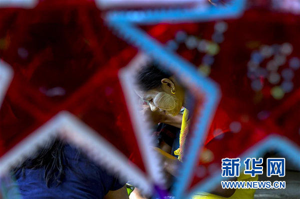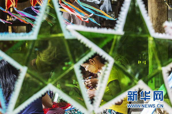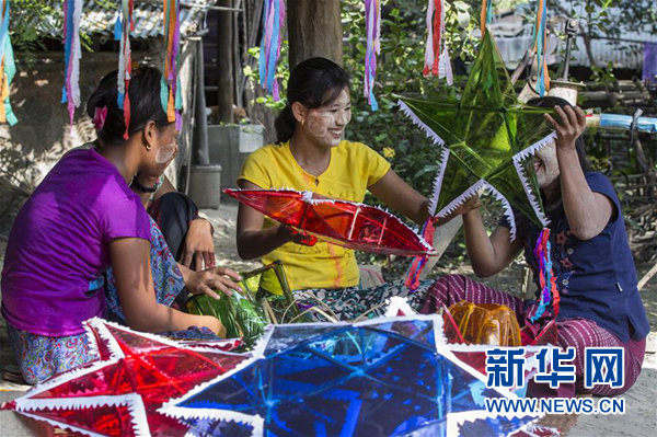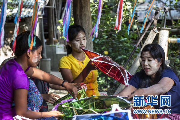 10月23日,在缅甸马圭省的一座村庄,当地女子在制作纸灯,迎接一年一度的点灯节。今年10月24日是缅甸的传统节日点灯节。 新华社/欧新