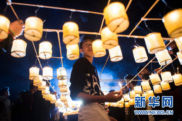↑11月14日,在缅甸东枝,一名男子点燃小型灯笼。 新华社/法新