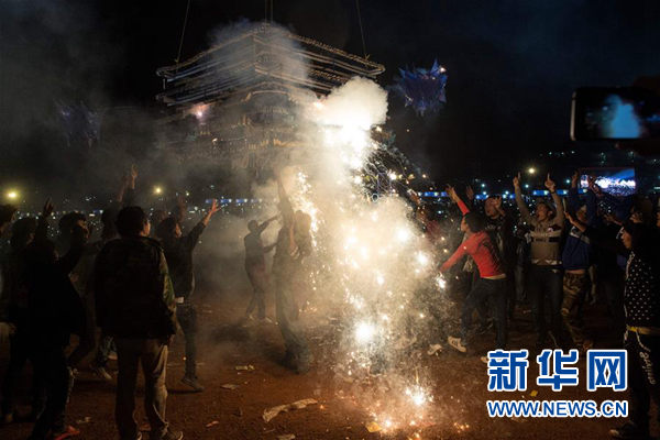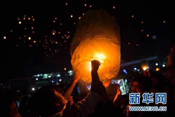 ↑11月14日,在缅甸东枝,人们参加点灯节活动。在缅甸东枝一年一度的点灯节上,人们放飞装满烟花的热气球,成为吸引游客的一大景观。 新华社/法新