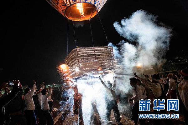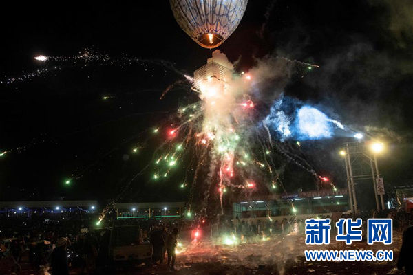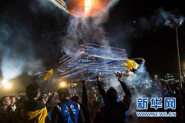 ↑11月14日,在缅甸东枝,人们欢庆热气球升空。 新华社/法新