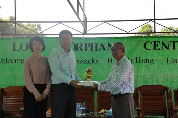 11月20日,中国驻缅甸大使洪亮夫妇在克钦邦首府密支那考察由中国使馆援建的“中缅友谊学校”——傈僳族“爱心孤儿院”和克钦族“恩泽乐园孤儿院”,看望在校师生,并代表中国使馆分别向两所学校捐赠了大米等生活物资和课桌椅等学习用品。