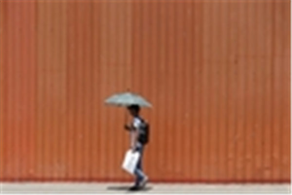 当地时间2019年4月28日,缅甸仰光,一名男子撑着遮阳伞走过马路。据缅甸气象和水文部门,4月26日,仰光气温达到了破纪录的42摄氏度。图/IC photo