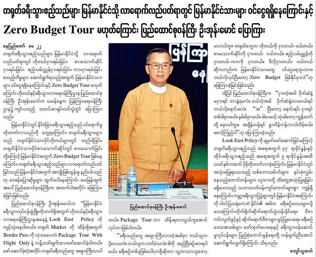 据《缅甸之光》报5月23日报导,中国游客进入缅甸时,租赁甚至购买旅馆、饭店,雇用导游,租借车辆,这些都会让缅甸人民获得收入,不会是零预算、零消费Zero Budget Tour,旅舍暨旅游部联邦部长在5月22日的记者招待会上如是说道。