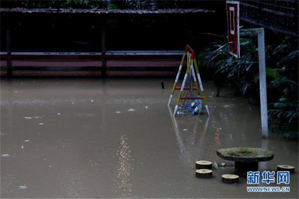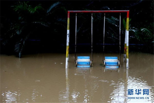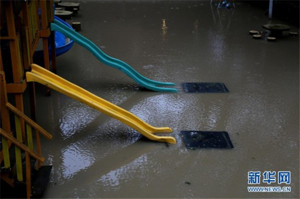 8月7日,在缅甸仰光,滑梯浸泡在洪水中。缅甸政府一名官员称,自7月份以来,因降雨引发的洪水已造成3人死亡。 新华社发(吴昂 摄)