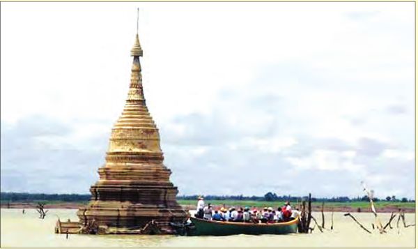 德班色水坝的最高水位为545英尺,水坝的最大存水量为279.4万英亩英尺(约合34.5亿立方米)。但今年雨季由于降雨量少,直到8月底时流进该水坝的水量才有12278英亩英尺(合1500立方米),与其总存水量相比简直是九牛一毛。目前水坝水位高度为506.15英尺,存水量为475755英亩英尺,只占其最大存水量的六分之一左右,所以才使沉没在水底下的许多建筑物重新浮现出来,当地水渠与水资源管理局的副局长U Tin Moe如是说道。