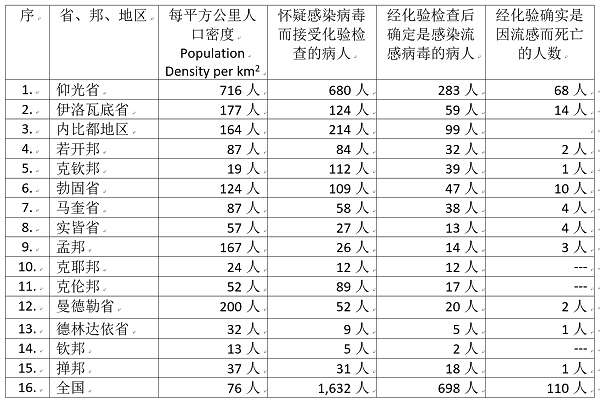 缅甸各省邦地区都有发现感染此流感的病患者,具体数据如下: