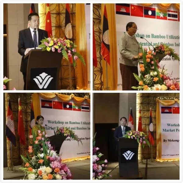 温凯穆、艾爱珊、陆文明分别致辞,感谢中方通过澜湄合作专项基金支持竹产业发展项目,表示澜湄流域竹资源十分丰富,开展产业技术合作有助于各国发展经济、改善民生。希望与会代表充分交流探讨,共同促进竹产业合作发展。