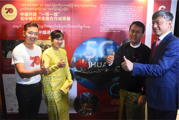 招待会现场还举办了中华人民共和国成立70周年图片展和中缅共建“一带一路”和中缅经济走廊合作成果展。展览通过图片、视频、实物等多种形式展示了新中国成立70年来的发展历程和中缅各领域合作成果。漂民登首席部长等嘉宾在展览前长时间驻足观看,高度评价新中国成立70年来取得的发展成就,赞叹中国高铁创造的中国速度,期待华为公司为缅甸带来5G时代,祝愿中缅经济走廊建设不断取得新进展。