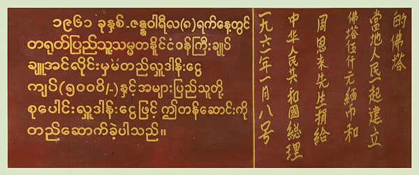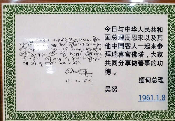 1961年1月8日周恩来总理在缅甸著名佛教圣地蒲甘良乌参访时为瑞喜宫佛塔捐款建了一座凉亭,供民众休息乘凉,有关部门以周恩来总理的捐款为引,与当地人民一起,在瑞喜宫佛塔广场建立了一座凉亭,凉亭上方写着“以中华人民共和国总理周恩来捐款为引和当地老百姓共同修建”,下款写着:1961年1月8日。
