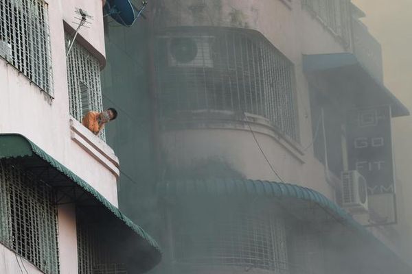 新华社照片,外代,2020年2月20日 (外代一线)(3)缅甸仰光一市场发生火灾 2月20日,在缅甸仰光,一名被困居民等待救援。 当日,仰光一市场发生火灾。
