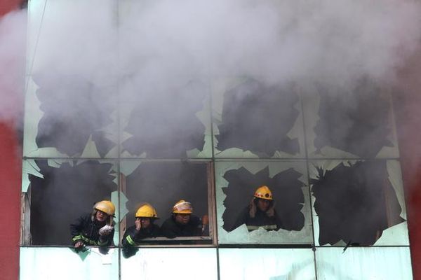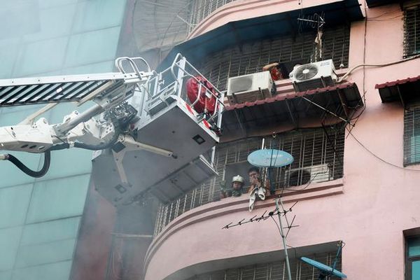 新华社照片,外代,2020年2月20日 (外代一线)(5)缅甸仰光一市场发生火灾 2月20日,在缅甸仰光,消防人员在火灾现场救援被困居民。 当日,仰光一市场发生火灾。
