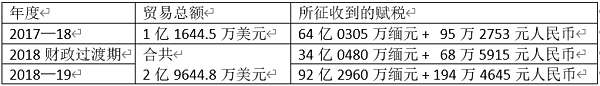 目前甘拜地贸易基地已是克钦邦主要的边贸口岸,由这贸易基地向中国进行进出口贸易工作,历年来的贸易额及所获得的赋税如下: