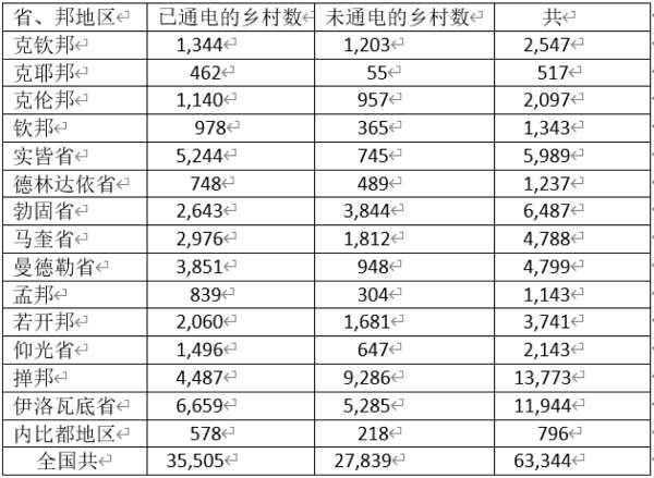 《缅甸之光》报4月3日发表了一组图表,介绍缅甸各省邦地区已通电的乡村总数。以下是有关具体数据: