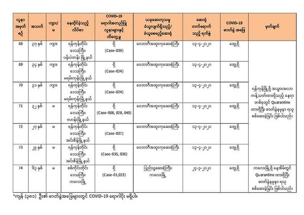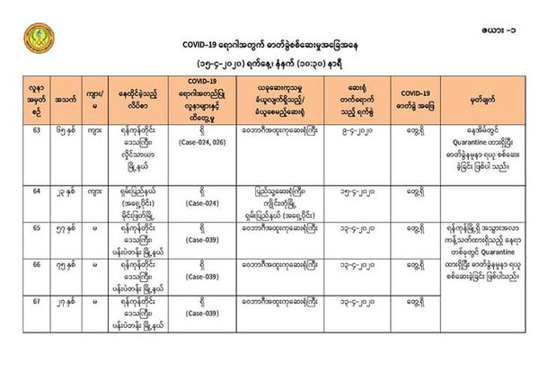 据仰光国家化验室4月14日所公布的数据资料,在对393名人员的化验样本进行化验检查后,发现在12名人员的样本中含有新冠病毒,其中1人(第63名确诊者)的个人资料已在4月14日晚上8时加以公布,剩下的381人的化验样本中没有发现此病毒。至此缅甸国内新冠病毒疫情的确诊人数达到了74人。