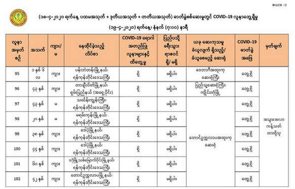 仰光国家卫生化验室于4月18日对第3批87名人员的化验样本进行化验检查时,发现有9人的样本中含有新冠病毒,其余87人的样本中没有发现病毒。