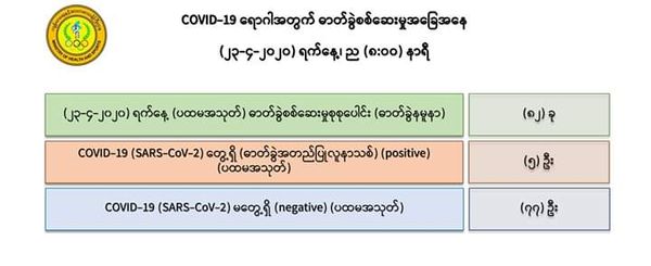 国家化验室4月23日对在医院或在住家接受隔离观察的第一批82名人员的化验样本进行化验检查时,发现5人的化验样本中含有此新冠病毒。其余77人的样本中没有此病毒。而接着在第二批及第三批的183人的化验样本中,没有发现此病毒。所以在265份化验样本中,共发现5人的样本中含有 此新冠病毒,其余260人的样本中没有此病毒。至此,缅甸新冠病毒确诊者人数已增至132人。
