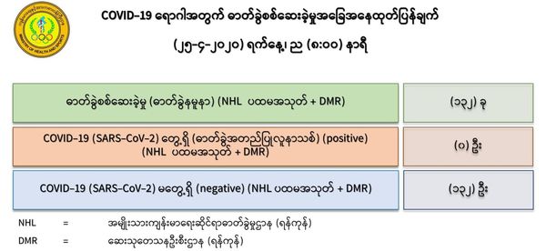 仰光国家卫生化验室(NHL)于4月24日下午对第一批92名人员的化验样本进行化验检查,而医药科研所(DMR)对40名人员的化验样本进行化验检查,共132人员的化验样本中,没有发现任何人的样本中含有新冠病毒。