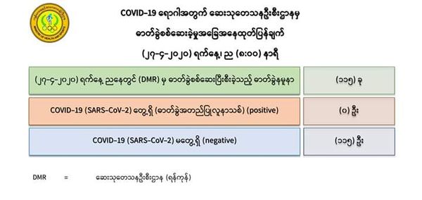 医药科研所4月27日对115名人员的化验样本进行化验检查,没有发现任何人的样本中含有新冠病毒。而同时仰光国家卫生化验室(NHL)对230名人员的化验样本进行化验检查时,同样没有发现此病毒。所以在4月27日及4月28日凌晨对所有的345份化验样本中,没有发现任何样本中含有新冠病毒。至此,缅甸新冠病毒确诊者人数仍维持在146人。