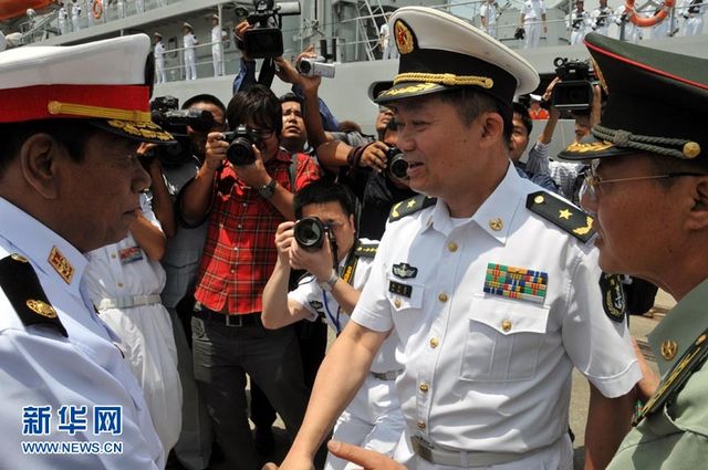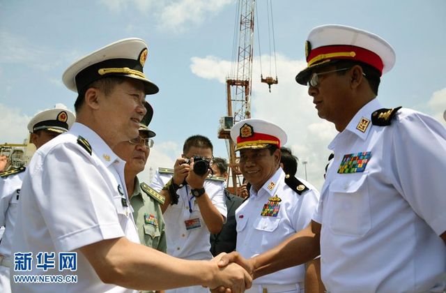 图为编队指挥员、海军参谋长助理韩小虎与缅甸海军将领握手致意。新华军事记者安晨 摄