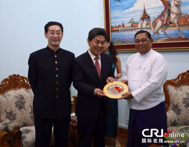 缅甸外长吴温纳貌伦向中国东盟中心秘书长马明强和六小龄童赠送礼物 摄影:张克强