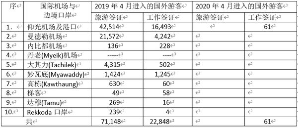 在这4月份内由各机场、港口及边境口岸进入的游客都为零,唯有仰光国际机场还有61人以工作签证进入。本来国外航空线自3月30日已完全停止,但还有因新冠病毒疫情的特殊班机的进入,所以有61名国外游客以工作签证进入。