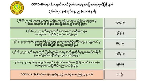 6月26日,仰光国家卫生化验室(NHL)对第一批的483名人员的化验样本进行化验检查,医药科研所(DMR)对 263名人员的化验样本进行化验检查,曼德勒人民卫生化验室(PHL, Mandalay)对64名人员的化验样本进行化验检查,毛淡棉人民卫生化验室(PHL, Mawlamyine)对163名人员的化验样本进行化验检查,仰光第一军医1000床位医院对91名人员的样本进行化验检查,共1064人的化验样本中,没发现任何人的样本中含有新冠病毒。