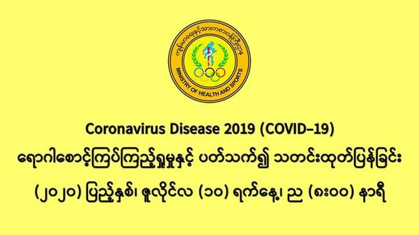 缅甸卫生暨体育部于7月10日晚上8时及7月11日上午8时分别发出公告,介绍缅甸国内这新冠病毒疫情发展的最新情况。