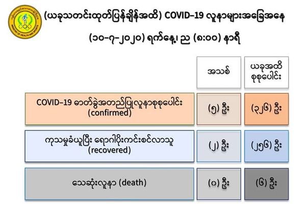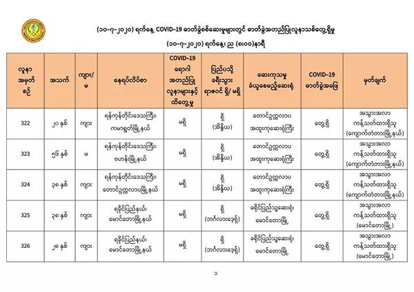 7月10日,仰光国家卫生化验室(NHL)对第一批的654名人员的化验样本进行化验检查,医药科研所(DMR)对 209名人员的化验样本进行化验检查,曼德勒人民卫生化验室(PHL, Mandalay)对140名人员的化验样本进行化验检查,毛淡棉人民卫生化验室(PHL, Mawlamyine)对103名人员的化验样本进行化验检查,仰光第一军医1000床位医院对196名人员的化验样本进行化验检查,共1302人的化验样本中,发现有5人的样本中含有新冠病毒。