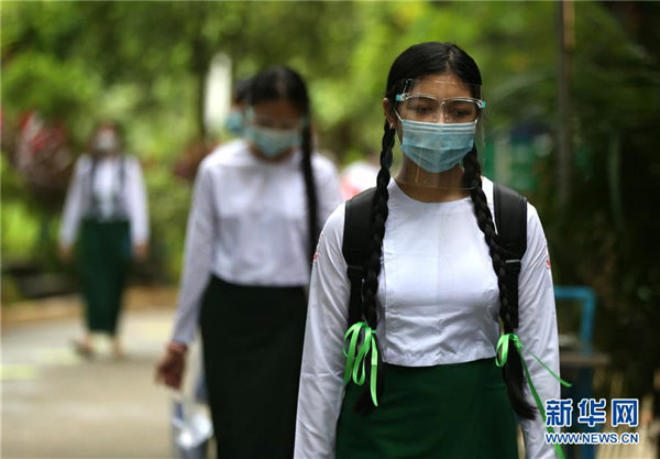 7月13日,前来报到的学生在缅甸仰光一所学校保持一定间距行走。 缅甸高中生于当日返校报到。 新华社发(吴昂摄)