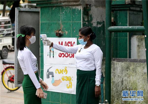 7月13日,老师在缅甸仰光一所学校门口为前来报到的学生测量体温。 缅甸高中生于当日返校报到。 新华社发(吴昂摄)