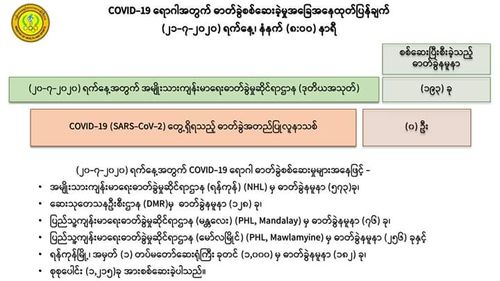 7月20日,仰光国家卫生化验室(NHL)对第一批380名人员的化验样本进行化验检查,医药科研所(DMR)对 128名人员的化验样本进行化验检查,曼德勒人民卫生化验室(PHL, Mandalay)对76名人员的化验样本进行化验检查,毛淡棉人民卫生花一岁半(PHL, Mawlamyine)对256名人员的化验样本进行化验检查,仰光第一军医1000床位医院对182名人员的化验样本进行化验检查,共1022人的化验样本中,没发现任何人的样本中含有新冠病毒。