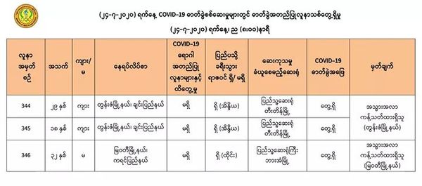 至此,缅甸国内新冠病毒确诊人数维持在346人。