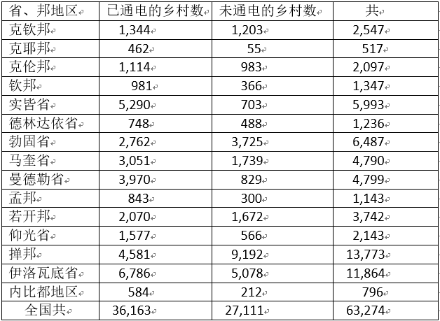 在发布近年来电力生产数据的同时,《缅甸之光》报发布另一图表,介绍缅甸各省邦地区已通电的乡村及未通电的乡村总数,具体数据如下表: