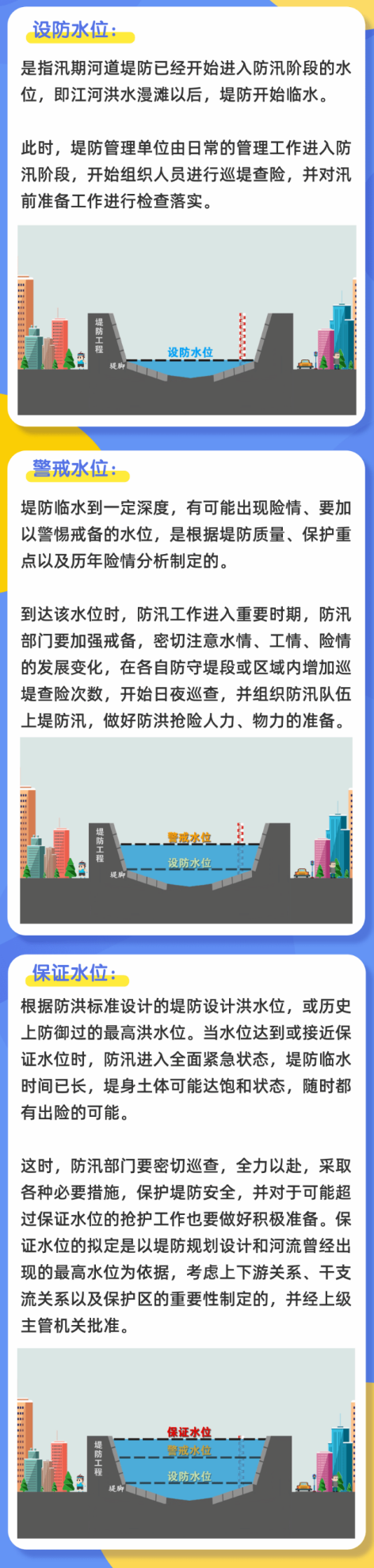 警戒水位(warning water level)是指在江、河、湖泊水位上涨到河段内可能发生险情的水位,一般来说,有堤防的大江大河多取决于洪水普遍漫滩或重要堤段水浸堤脚的水位,是堤防险情可能逐渐增多时的水位。