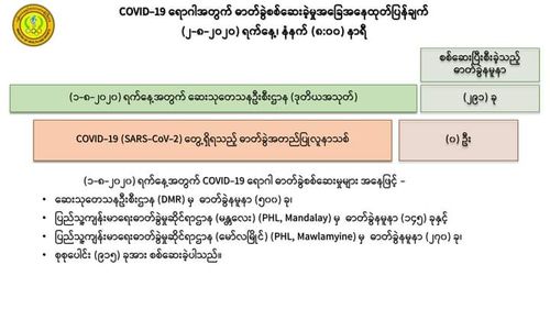 8月1日,医药科研所(DMR)对 209名人员的化验样本进行化验检查,曼德勒人民卫生化验室(PHL, Mandalay)对145名人员的化验样本进行化验检查,毛淡棉人民卫生化验室(PHL, Mawlamyine)对270名人员的化验样本进行化验检查,共624人的化验样本中,没发现任何人的样本中含有新冠病毒。