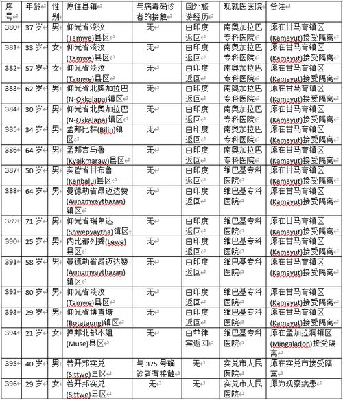 1天之内发现17名新确诊者,应该是这一个多月来1天之内发现最多确诊者的事件了。这17人中,15人是由国外回归者,这当中有14人是由印度回归,1人由菲律宾回归。而最后2人是若开邦实兑市的民众,其中1人肯定是与375号确诊者有关联,另1人却还无法确定其病毒来源,这最后2人可说是国内传染的病例了。