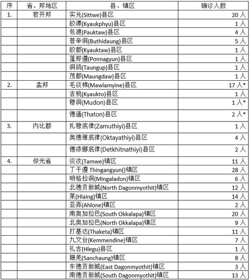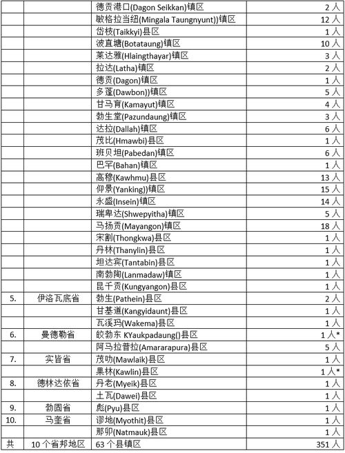 351名确诊者中,仰光省33个县镇区感染272人,占总人数的77%,仰光省名副其实为全缅疫情的“重灾区”。确诊人数最多的镇区还是丁干遵镇区,在连续多次确诊人数遥遥领先各县区之后,这一次还是以28人的“成绩”领先各县区。与之相比孟邦2个县区19名确诊者的人数,是显得“小巫见大巫”了;但毛淡棉市1天再发现18名确诊者,也说明其疫情蔓延相当严重。另外若开邦8个县区感染34人,也说明作为“第二波”疫情的始发地,该地区的疫情蔓延情况还相当严峻。内比都3个县区感染7人,曼德勒省2个县区6名确诊者,虽说人数不算多,但疫情已扩展到这些省、地区的多个县镇,连同以前发现的旧确诊者,其蔓延情况不能掉以轻心,而属曼德勒省内“重灾区”之一的阿马拉普拉县区,仍然还有新确诊者出现,情况还不乐观。至于其他其他几个省份,伊洛瓦底省3个县4名确诊者,实皆省、德林达依省、马奎省各2个县区各2名确诊者,似乎都算不了什么,但仍是不可掉以轻心。勃固省1个县区1名确诊者,似乎更是属于“小儿科”,但这彪县是第一次出现确诊者,希望这不会演变成“星火燎原”的局势,因为勃固省已出现岱乌(Daik-U)、克瓦(Kawa)这两个疫情“重灾区”了。