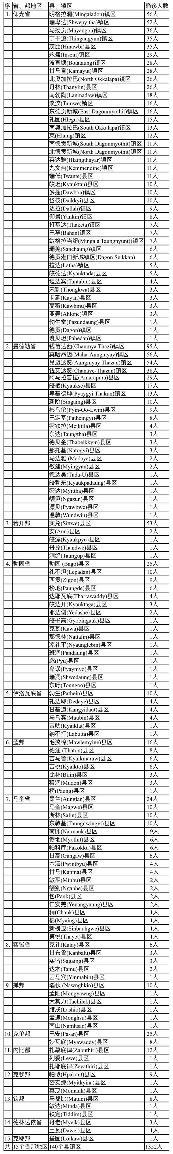 1352名确诊者中,仰光省确诊人数603人,占总人数的45%,确诊人数比例降到50%以下但仍是位居全国第一位,确诊的县镇区总数为41个县镇区,除了孤悬海外的可可岛及闹市区(Downtown)中的班贝坦镇区之外,其余县镇区都是榜上有名。确诊人数最多的县镇区为明加拉洞镇区(56人),其次为瑞卑达镇区(52人),其余县镇区确诊人数都少于40人,有20个县镇区的确诊人数在10人及10人以下。