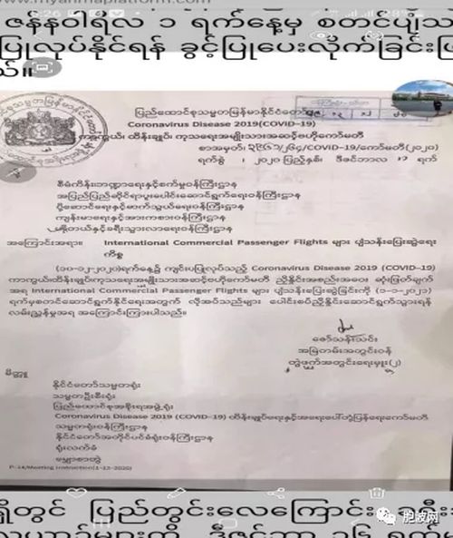 缅甸联邦共和国运输部航空司(仰光),2020年12月12日公布字号8635的通告。该通告说,由于疫情肆虐,之前曾经发布通告指示,将国内航班停飞至2020年12月15日。现在经由国家疫情防控治委员会的指示,自2020年12月16日开始,将恢复国内航班。因此特别通知所有航空公司以及机场人员,务必按照卫生与体育部发布的各项规定指标,于12月16日开始将恢复国内航班工作落实到位。