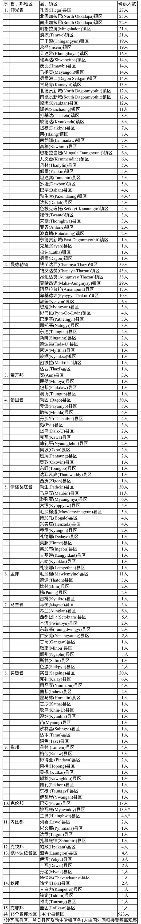 923名确诊者中,仰光省确诊人数392人,占总人数的42%,确诊人数比例及确诊人数略有下降,确诊的县镇区总数为41个县镇区。确诊人数最多的县镇区为礼固区 (27人),其次为北奥加拉巴镇区(25人),其余县镇区确诊人数都少于25人,有24个县镇区的确诊人数在10人以下。各县镇的确诊人数都有相当程度的下降,只是是否能维持继续下降的趋势,还有待观察。